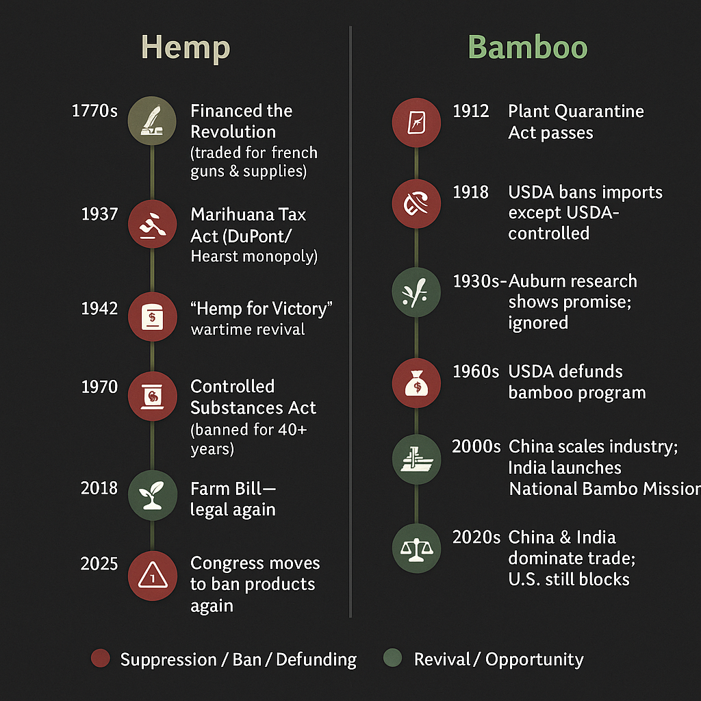 And hemp isn’t alone. Bamboo has lived the same cycle for over a century. USDA locked it down with the Plant Quarantine Act of 1918, strangled research just as Auburn proved it could outperform pine pulp, then abandoned it in the 1960s while China and India scaled bamboo into a strategic $60B industry backed by national missions and FAO/INBAR recognition. America still has no national bamboo program.